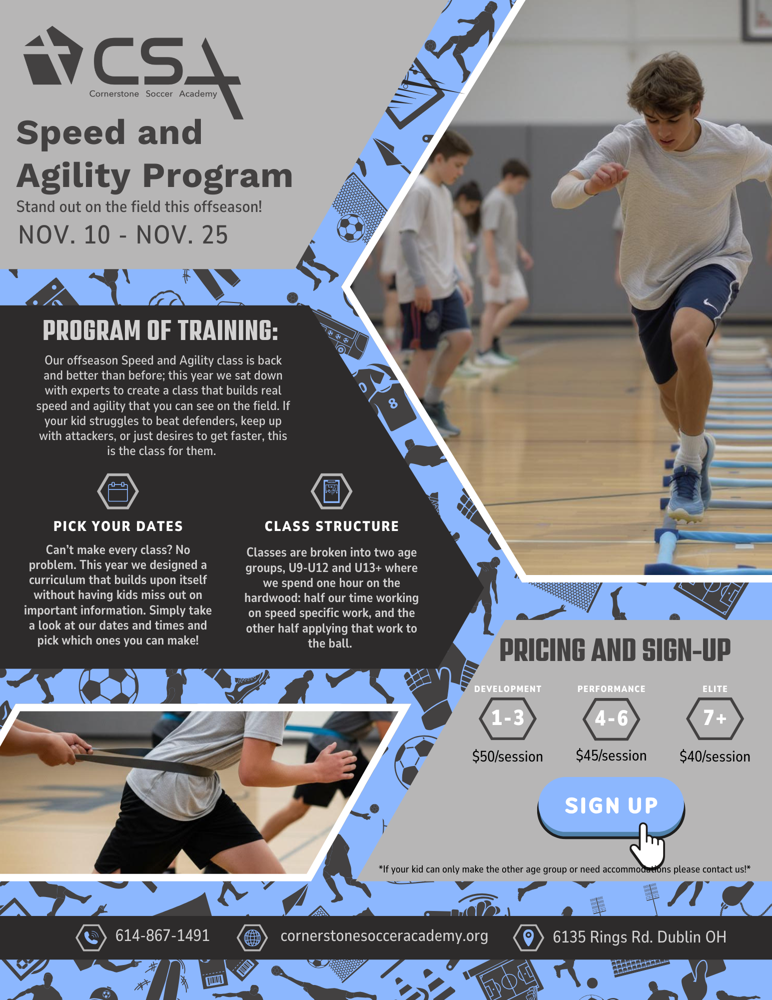 It’s time for year two: in this rendition of the Speed and Agility Program we have sat down with to create a class that builds real speed and agility that you can see on the field. If your kid struggles to beat defenders, keep up with attackers, or just desires to get faster, this is the class for them. Classes are broken into two age groups, U9-U12 and U13+ where we spend one hour on the hardwood: half our time working on speed specific work, and the other half applying that work to the ball.